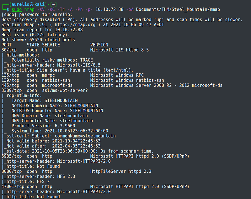 I started with enumerating the services , OS versions, and running default script scan for all the ports and saved the result into a file.