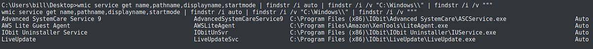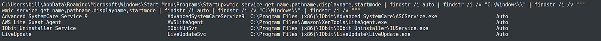 wmic service get name,pathname,displayname,startmode | findstr /i auto | findstr /i /v “C:\Windows\\” | findstr /i /v “””