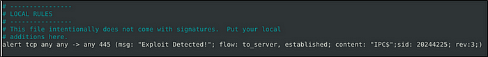 Use local-1.rules empty file to write a new rule to detect payloads containing the “\IPC$” keyword.