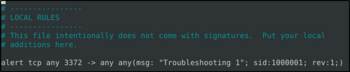 - alert tcp any 3372 -> any any (msg: “Troubleshooting 1”; sid:1000001; rev:1;)