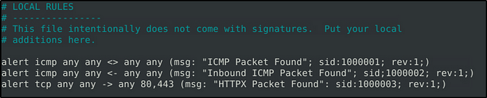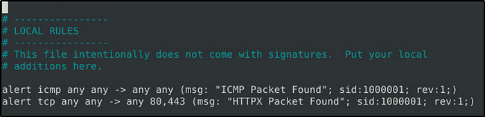 sudo nano local.rules #editing the local rule with a text editor, nano
