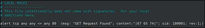 - alert tcp any any <> any 80 (msg: “GET Request Found”; content:”|67 65 74|”;nocase; sid: 100001; rev:1;)
