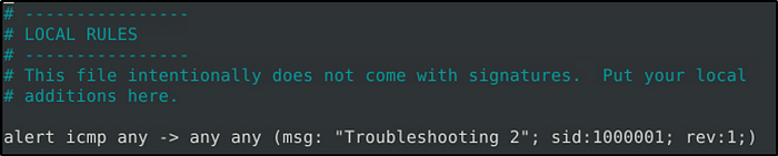 - alert icmp any any -> any any (msg: “Troubleshooting 2”; sid:1000001; rev:1;)