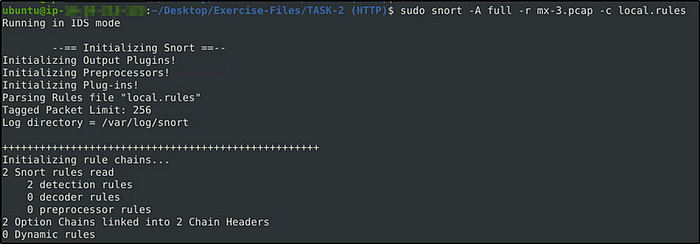 sudo snort -A full -r mx-3.pcap -c local.rules -l . #Investigating a pcap file
