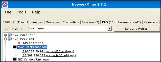 Use the “2.7.2” version of NetworkMiner. “Under the “Hosts” menu, expand the IP addresses. One of the IP addresses has two IP addresses that use the same MAC address.