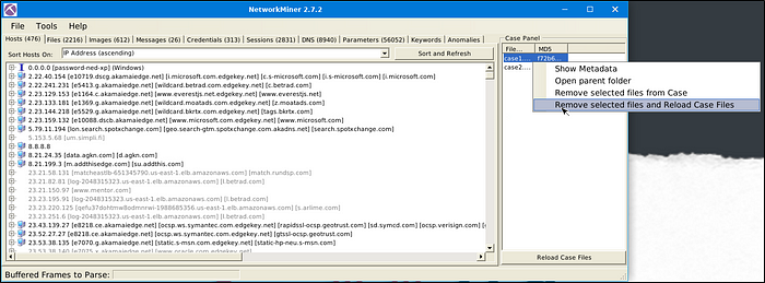 To remove a pcap file, go to “Case Panel’, select and right-click the file that we want to remove, in this example, “case1.pcap”. Select “Remove selected files and Reload Case Files”.