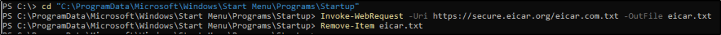 cd "C:\ProgramData\Microsoft\Windows\Start Menu\Programs\Startup" Invoke-WebRequest -Uri https://secure.eicar.org/eicar.com.txt -OutFile eicar.txt