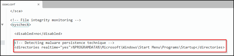 Wazuh automatically monitors the startup folder without any user intervention. The default configuration file of Wazuh, located at C:\Program Files (x86)\ossec-agent\ossec.conf, includes the following setting for monitoring the startup folder:
