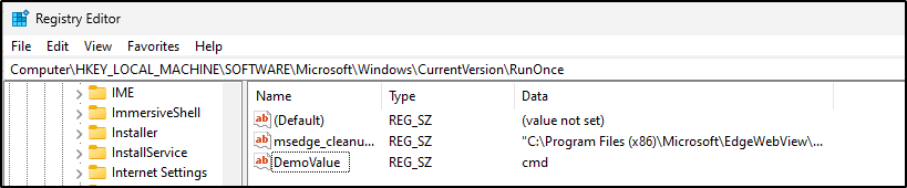 DemoValueand registry value datacmdto theHKEY_LOCAL_MACHINE\Software\Microsoft\Windows\CurrentVersion\RunOnceregistry keys.