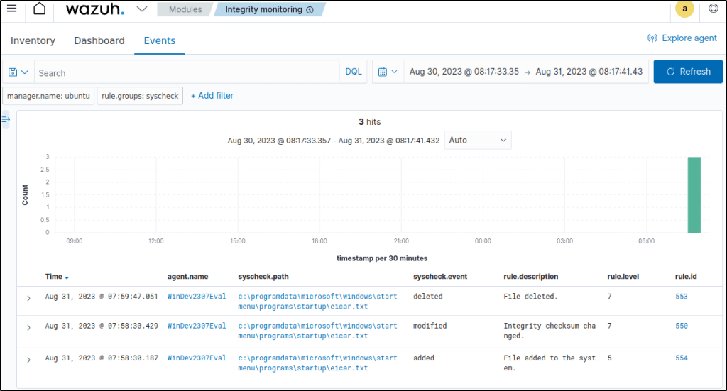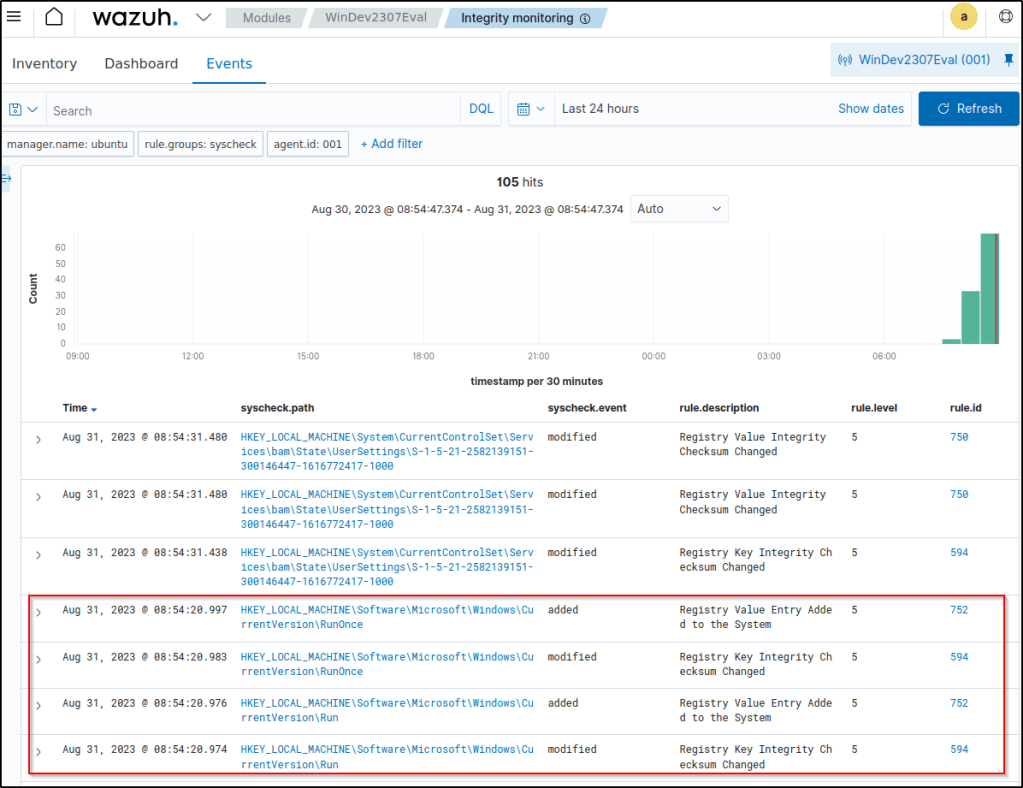 Navigate to Modules > Integrity monitoring on the Wazuh dashboard to view the alert generated when the FIM module detects changes in the Windows startup registries.