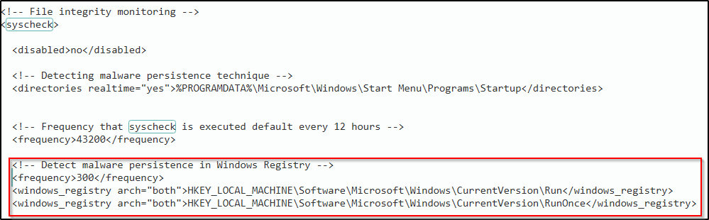Wazuh automatically monitors the startup registry keys without the need for any special user action or configuration. The default configuration file for the Wazuh agent located at C:\Program Files (x86)\ossec-agent\ossec.conf includes a setting that enables the monitoring of the startup registry keys.
