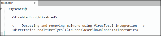 2. Include an entry in the <syscheck> block to set up monitoring for a specific directory in almost real-time. In this scenario, I will configure Wazuh to monitor the C:\Users\<USER_NAME>\Downloads folder. Replace <USER_NAME> with the relevant user name.