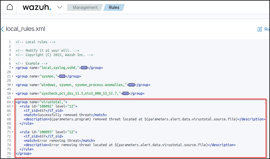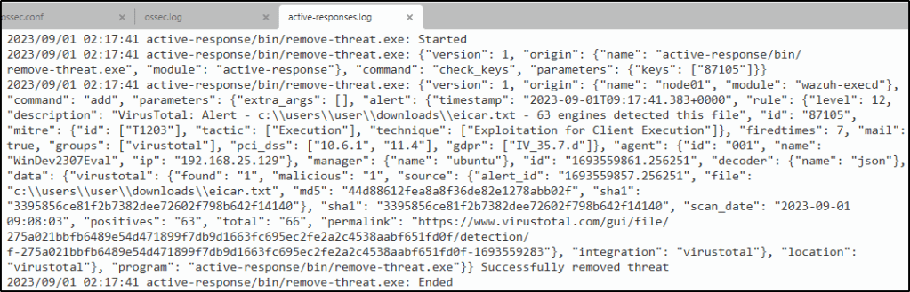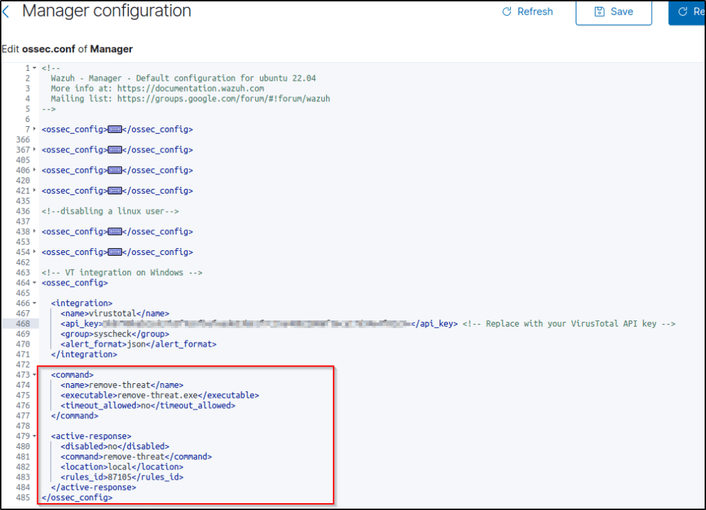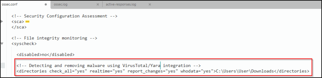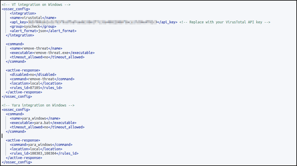 The following section covers where VirusTotal integration is activated, with the same active response configuration.