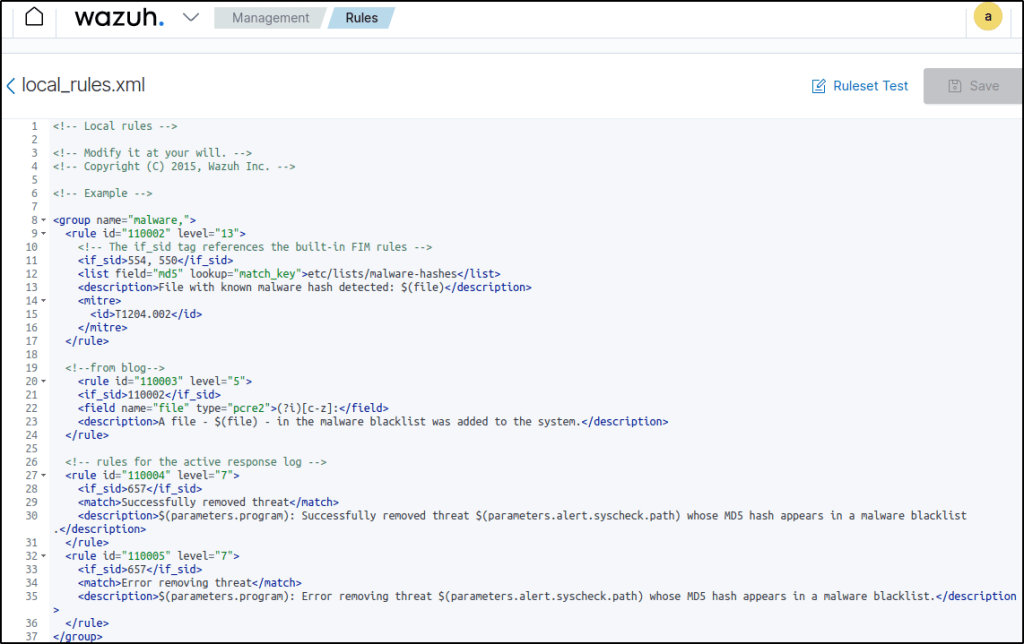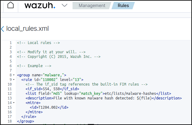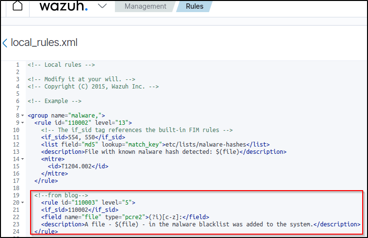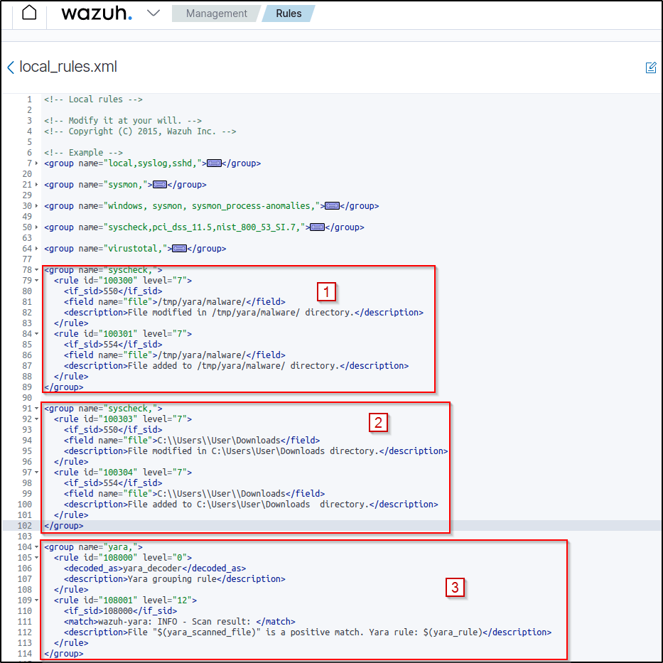 2. Add the following rules to the Wazuh server /var/ossec/etc/rules/local_rules.xml file. The rules detect FIM events in the monitored directory. They also alert when malware is found by the YARA integration: