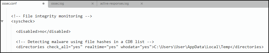 1. Search for the <syscheck> block in the Wazuh agent C:\Program Files (x86)\ossec-agent\ossec.conf file. Make sure that <disabled> is set to no. This enables the Wazuh FIM module to monitor for directory changes.