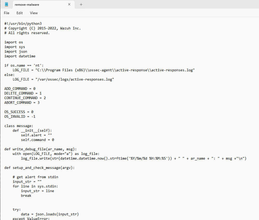6. Create an active response script remove-threat.py to remove a file from the Windows endpoint: