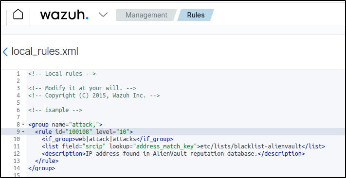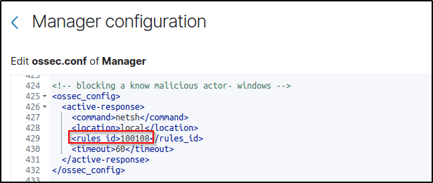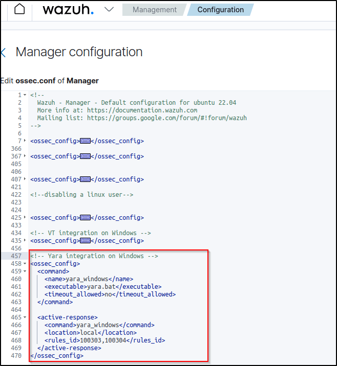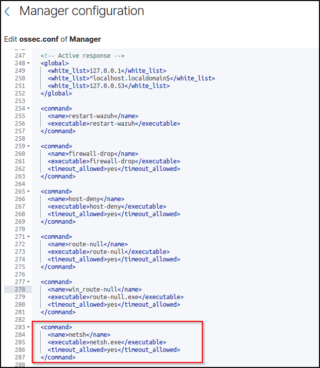 3. Add the following active-response configuration to the Wazuh server /var/ossec/etc/ossec.conf file: