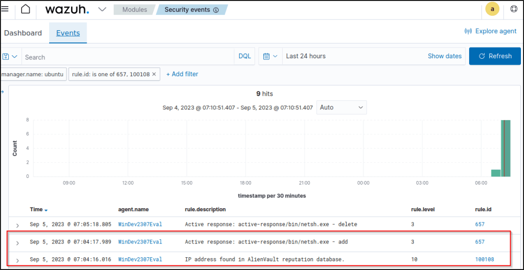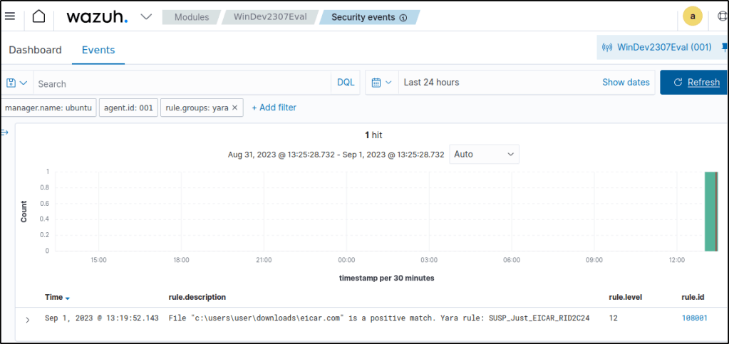 Filter the events with rule.groups:yara. Using Yara rule, the malware sample was properly identified.