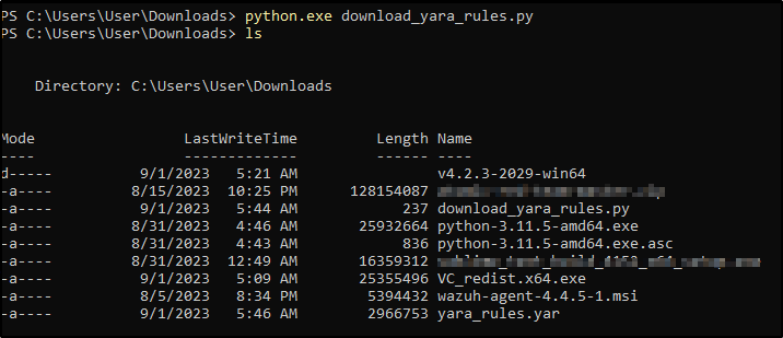 8. Run the following commands to download the rules and place them in the C:\Program Files (x86)\ossec-agent\active-response\bin\yara\rules\ directory: