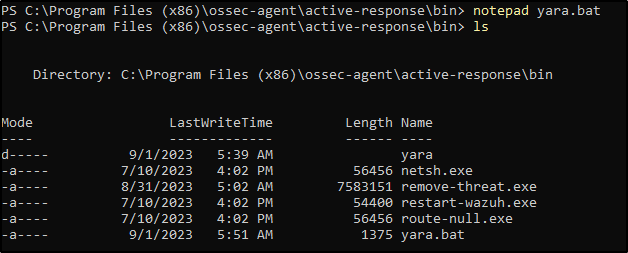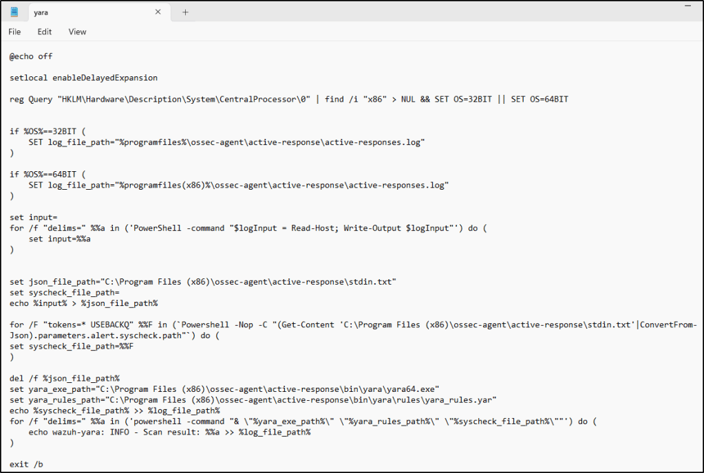 1. Create the yara.bat script in the C:\Program Files (x86)\ossec-agent\active-response\bin\ directory. This is necessary for the Wazuh-YARA active response scans:
