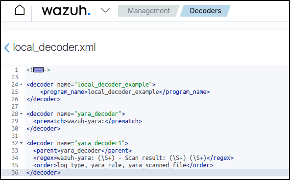 1. Add the following decoders to the Wazuh server /var/ossec/etc/decoders/local_decoder.xml file. This allows extracting the information from YARA scan results: