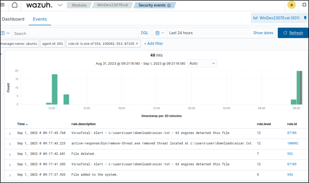 rule.id: is one of 550,553,554. - The filtered events show the file I created, adding a content to the file therefore changing its hash value, then finally its deletion.