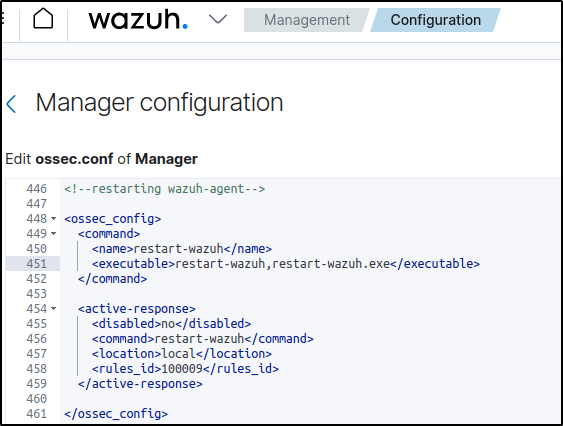 When modifying the configuration file, it is important to restart the agent.Saving the changes will enable the active-response feature and trigger a restart of the agent if the part about “Restarting the Wazuh agent with active response” is included in the implementation.