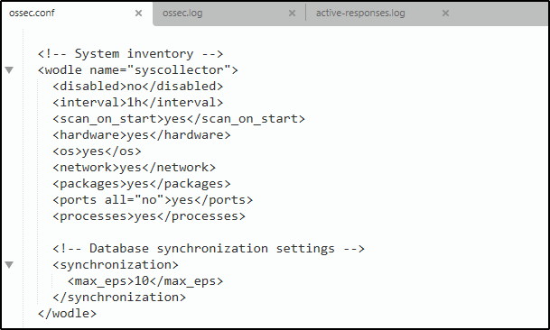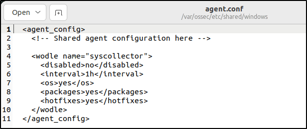 The following block represents the standard configuration for Syscollector, which is included in the Wazuh agent configuration file: