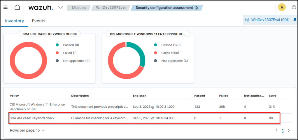 4. Open Notepad as an administrator, create a new SCA policy file with the following content and save it as C:\Program Files (x86)\ossec-agent\custom-sca-files\keywordcheck.yml: