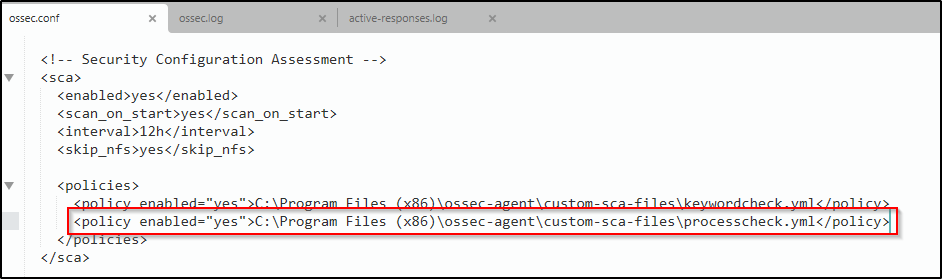 <policy enabled="yes">C:\Program Files (x86)\ossec-agent\custom-sca-files\keywordcheck.yml</policy>