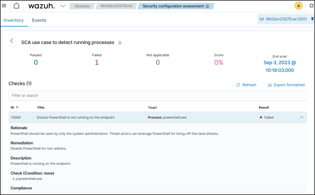 PowerShell is commonly used by system administrators to configure systems. However, regular users tend to use it less often. Malicious individuals may exploit PowerShell as part of a “living-off-the-land” attack strategy. To set up the Wazuh SCA module for detecting PowerShell processes and simulating an attack, following are the instructions:
