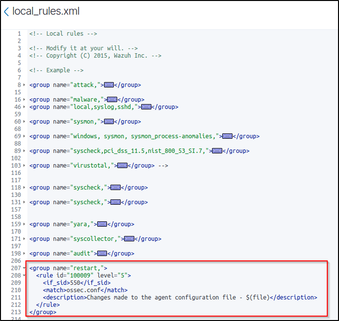 5. Enable the policy file by adding the following lines to the <ossec_config> block of the Wazuh agent configuration file at /var/ossec/etc/ossec.conf: